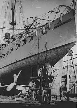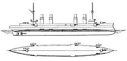 The ship had a curved armor deck that consisted of mild steel that curved down at the sides to provide a measure of vertical protection. It was 25 mm (0.98 in) thick on the flat portion amidships, directly above the ship's engine rooms and the torpedo tubes; the downward sloping sides increased to 45 mm (1.8 in) and then tapered back down to 25 mm. Further forward and aft of the middle section, where the deck covered the boiler rooms and ammunition magazines, the deck was reduced to 15 mm (0.59 in) on the flat and 35 to 15 mm (1.38 to 0.59 in) on the slopes. The bow received 10 mm (0.39 in) of plating, and all sections of the deck were layered on 20 mm (0.79 in) of hull plating.[8] Above the armor deck was a cofferdam that was 380 mm (15 in) wide and was composed of numerous watertight compartments. An anti-splinter deck that was 25 mm (0.98 in) thick formed the roof of the cofferdam, and the entire structure was intended to contain flooding in the event of damage. The forward conning tower was protected by 100 mm (3.9 in) on the sides. The ship's main guns were each fitted with gun shields that were 70 mm (2.8 in) thick, and their ammunition hoists were protected by armored tubes of 25 mm thick steel.[12]