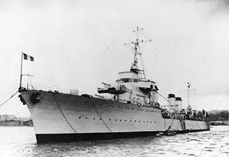 Bison served during the Norwegian Campaign in World War II. While evacuating Allied troops at Namsos, the ship came under German air attack and exploded after being struck in the forward magazine by a bomb, dropped by a Ju 87 from I./StG 1, killing 136 members of her crew and causing the ship to sink by the bow. The British destroyer HMS Afridi came to the aid of the surviving crew, rescuing sixty-nine of the French sailors in the water and sinking the hull of the ship.[6] However, Afridi soon came under air attack and sank as well, and among the dead were thirty-five of the surviving crew of Bison. The surviving crews from Bison, Afridi, and the troops they had evacuated were rescued by the destroyers Imperial, Griffin and Grenade.[7]