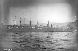 Casque was ordered from Forges et Chantiers de la Méditerranée and was launched from its La Seyne-sur-Mer shipyard on 25 August 1910. The ship was completed in 1911.[3] When the First World War began in August 1914, Casque was assigned to the 1st Destroyer Flotilla (1re escadrille de torpilleurs) of the 1st Naval Army (1ère Armée Navale). During the preliminary stages of the Battle of Antivari, Montenegro, on 16 August, the 1st, 4th and 5th Destroyer Flotillas were tasked to escort the core of the 1st Naval Army while the 2nd, 3rd and 6th Flotillas escorted the armored cruisers of the 2nd Light Squadron (2e escadre légère) and two British cruisers. After reuniting both groups and spotting the Austro-Hungarian protected cruiser SMS Zenta and the destroyer SMS Ulan, the French destroyers played no role in sinking the cruiser, although the 4th Flotilla was sent on an unsuccessful pursuit of Ulan. Having broken the Austro-Hungarian blockade of Antivari (now known as Bar), Vice-Admiral (Vice-amiral) Augustin Boué de Lapeyrère, commander of the 1st Naval Army, decided to ferry troops and supplies to the port using a small requisitioned passenger ship, SS Liamone, escorted by the 2nd Light Squadron, reinforced by the armored cruiser Ernest Renan, and escorted by the destroyer Bouclier with the 1st and 6th Destroyer Flotillas under command while the rest of the 1st Naval Army bombarded the Austro-Hungarian naval base at Cattaro, Montenegro, on 1 September. Four days later, the fleet covered the evacuation of Danilo, Crown Prince of Montenegro, aboard Bouclier, to the Greek island of Corfu. The flotilla escorted multiple small convoys loaded with supplies and equipment to Antivari, beginning in October and lasting for the rest of the year, always covered by the larger ships of the Naval Army in futile attempts to lure the Austro-Hungarian fleet into battle. Amidst these missions, the 1st and 6th Flotillas were led by the French destroyer Dehorter as they conducted a sweep south of Cattaro on the night of 10/11 November in an unsuccessful search for Austro-Hungarian destroyers.[4]