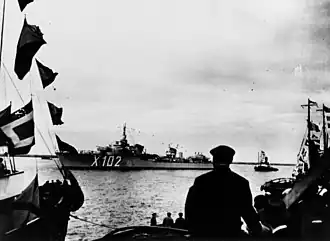 In December 1938–January 1939, the bridge wings were enlarged to accommodate the Hotchkiss machine guns. After the war began, depth-charge stowage increased to 48 and a pair of rails were installed on the stern for 35-kilogram (77 lb) depth charges. Each rail could accommodate 3 depth charges and 15 more were stored in the magazine. In early 1940 twin-gun 37 mm mounts replaced the single-gun mounts and a single Browning 13.2-millimeter anti-aircraft machine gun was installed on the quarterdeck.[5]