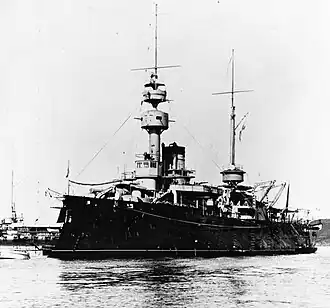 The Northern Squadron remained unchanged for 1901, apart from the addition of Hoche.[20] During the fleet maneuvers that year, the Northern Squadron steamed south for joint maneuvers with the Mediterranean Fleet. The Northern Squadron ships formed part of the hostile force, and as it was entering the Mediterranean from the Atlantic, represented a German squadron attempting to meet its Italian allies. The exercises began on 3 July and concluded on 28 July. In August and September, the Northern Squadron conducted amphibious assault exercises. On 28 August, they escorted a group of troop ships from Brest to La Rochelle. The ships conducted a simulated bombardment of the port, neutralized the coastal defenses, and put some 6,000 men ashore.[21] On 9 March 1902, Amiral Baudin, was transferred to the Reserve Squadron in the Mediterranean Fleet,[3] along with Carnot, and Hoche .[22] She was briefly recommissioned to replace the old ironclad Couronne during a re-boilering before being returned to reserve status on 7 November 1904. She was placed in special reserve at Toulon on 25 April 1907, then decommissioned on 15 May 1908. Following her removal from the naval register on 6 June 1909, she replaced Var as a barracks ship. Amiral Baudin was condemned on 31 October 1910, placed for sale on 1 August 1911, and sold to a M. Benédic and broken up.[3]