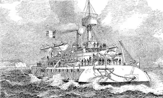 From the 1870s, the French Navy (Marine Nationale) developed a smaller ironclad to complement seagoing battleships but more suited to coastal defence, having a lower speed and less endurance. Although less maneuverable than their larger peers, they were heavily armed, able to strike with guns, torpedos and a ram.[1] Following the French defeat in the Franco-Prussian War and the emergence of the Jeune École doctrine, these matured as the Tempête class of ironclad coastal defense ships.[2] Originally ordered in January 1875 as the third member of the class, Tonnant was designed by the naval architects Louis de Bussy and Émile Marchegay. However, soon after the ship was laid down, the Minister of the Navy (Ministère de la Marine) Louis Raymond de Montaignac de Chauvance asked for the design to be amended to have greater protection on its deck and less on its breastwork alongside increased speed, all without increasing the displacement.[3]
