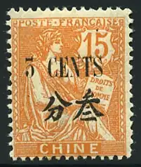 For the above post offices, the French government issued stamps of the "Peace and Commerce" series overprinted with the word "CHINE" beginning in 1894. Stamp issues of the 20th century initially included overprints applied to some of the stamps issued for use in French Indochina, and continued with stamps printed specifically for use in China. Some earlier 20th century stamps were issued only with face values expressed in French francs, but all later issues were overprinted with the equivalent of the stamp’s Chinese currency face value expressed in both French and Chinese.