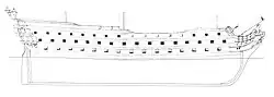 By 3 January 1764, the commission was requesting revised versions of the plans as to reduce the dimensions of Bretagne.[21] On 23, Groignard submitted his new plans, along with a memorandum underlining that this version would not allow the ship to hold six month worth of food and was compromising her stability, speed and maneuverability; furthermore, he warned that the lower headspace of the gundecks in the smaller project would hinder evacuation of smoke from the guns in combat conditions.[22] On 19 February, Choiseul declined to approve the revised plans and requested a third version; Groignard quickly completed the new plans and went directly to Paris himself to submit them, short-circuiting the construction Commission of the Estates of Brittany[23] and talking Choiseul out of the notion that the lower battery could be armed with 24-pounders instead of 36-pounders to reduce the cost.[24][17] On 7 May, Choiseul informed the Commission that his plans had met with approval and that the construction could begin.[24]