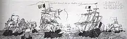 On 8 July 1782,[40] Bretagne departed Brest under Captain Charles Picot de Dampierre to join the Franco-Spanish combined fleet still besieging Gibraltar, arriving on 11 along with Invincible, Robuste, Protecteur, Actif, Zodiaque, Bien Aimé and Guerrier.[42] Her cutter rescued men from the crew of the Spanish floating battery Talla Piedra on 13 September. Bretagne, under Dampierre,[43][44] blockaded Gibraltar until 10 October, when a gale damaged her rigging, killing a helmsman and ripping anchors from the ship.[40] On 13 October 1782, the fleet moved to intercept a British squadron, resulting in the Battle of Cape Spartel on 20 where Bretagne sustained 5 men wounded.[38][40] Bretagne then returned to Cadiz harbour in preparation for an expedition to America under Admiral d'Estaing, but by then the Peace of Paris had been concluded and Bretagne returned to Brest.[40]
