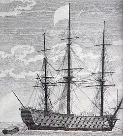 Bretagne was a large 110-gun three-decker French ship of the line, built at Brest, which became famous as the flagship of the Brest Fleet during the American War of Independence. She was funded by a don des vaisseaux grant by the Estates of Brittany.[2] She was active in the European theatres of the Anglo-French War and of the French Revolutionary Wars, notably taking an important role in the Glorious First of June. Later, she took part in the Croisière du Grand Hiver and was broken up.[4]