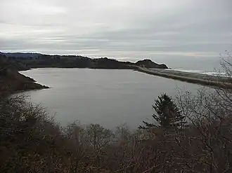 Freshwater Lagoon is similar to other coastal features of northern California including Humboldt Bay to the south and Lake Earl to the north. An alluvial plain is surrounded by steep uplands. Hills adjacent to Freshwater Lagoon have been identified as undivided pre-Cretaceous metasedimentary rock.[1] Studies around Humboldt Bay indicate tectonic activity along the Cascadia subduction zone has caused local sea level changes at intervals of several centuries.[2] The plain may support fresh water wetlands or Sitka Spruce forests following uplift events and salt marsh or inundated shellfish beds following subsidence events. The relatively small catchment basin tributary to Freshwater Lagoon has allowed formation of a durable coastal sand bar which has not been breached by recent storm events. Precipitation usually percolates through the bar without forming a surface channel.