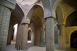 After this, the later changes to the mosque were more limited. Nonetheless, nearly every period saw some work done on the mosque, reflecting the changing needs of the community and the changing tastes of new rulers.[2][7] Under the Ilkhanid sultan Uljaytu (r. 1304–1317), the arcade around the sides of the courtyard was vertically divided into two levels, as it appears today.[2] Uljaytu also created another rectangular prayer hall or "winter hall" adjoining the north side of the western iwan of the mosque. This hall is covered by a series of remarkable transverse vaults, while its southern wall features an elaborately carved stucco mihrab dated to 1310.[7][2] The mihrab is one of the finest works of Iranian or Islamic sculptural art from this period. It was crafted by Haydar, a highly respected calligrapher of the time who included his signature in the work.[10]: 10–11