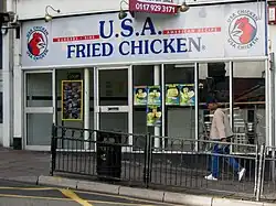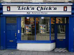 Restaurants are commonplace in inner city areas of the United Kingdom.[2] The United Kingdom has one of the largest, fastest growing and most diverse fried chicken markets in the world, with about 1,000 individual brands and 1,700 outlets.[3] Shop signs are commonly designed in a red, white and blue colour scheme, and include a drawing or cartoon of a chicken, as well as a reference to the Southern United States.[4]