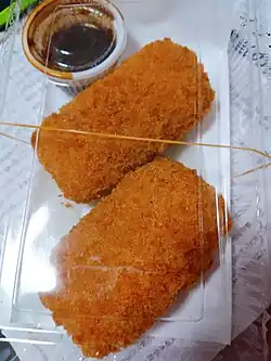 Kani cream croquette, or Kani cream korokke, a Japanese take on the French croquette, consists of a creamy filling of crabmeat and béchamel sauce, coated in panko breadcrumbs and deep-fried, often made with imitation crab meat. |