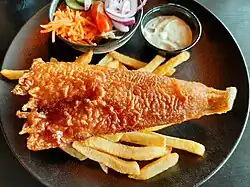 Battered fish which is deep-fried and served with chips. A popular take-away food in the United Kingdom, Ireland, Australia, New Zealand, Canada and South Africa. |
