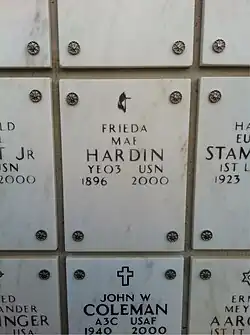 Frieda Mae Green Hardin (September 22, 1896 in Eden Valley, Minnesota – August 9, 2000 in Livermore, California) was an American veteran. She served in World War I and in 1997 was prominently involved in the ceremony dedicating the Women in Military Service for America Memorial. Upon her death at the age of 103, Hardin was described as the "oldest female veteran in the U.S."[1]