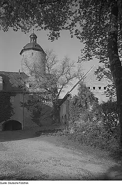 The town of Leutenberg grew up as a result of the castle's presence. The castle was built in three phases: the massive Bergfried (keep) and the east wing, which originated in a freestanding residential tower, are the oldest parts; the north wing was built between 1362 and 1375; and the castle took on its current appearance in a third period of construction in the early 16th century, when the south wing was added and the defensive building reconstituted as a primarily residential castle.[5] Since then, the castle has suffered repeated damage from fires, for example in 1567, 1695, 1726, 1800 and 1934. In the last fire, in 1934, the east, north and west wings were gutted and much of the historic interior was destroyed, including the 17th-century chapel.[5] After rebuilding, the castle was used as part of an educational camp for evacuee schoolboys during World War II, then requisitioned for scientists from Peenemünde;[6] during the Soviet administration and under the German Democratic Republic it was a holiday resort for Zellwolle Schwarza (1947–51), was administered by the State Forestry Service (1952–56) and then became a residence for the Council of Ministers.[1][4] Between 1991 and 1993 it underwent a comprehensive restoration and has since been a specialised dermatological hospital.