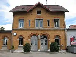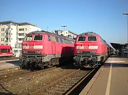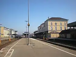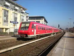 Friedrichshafen Stadt (city) station is the largest railway station of the city of Friedrichshafen on Lake Constance (Bodensee) and a railway junction in the German state of Baden-Württemberg. It has five tracks and is classified by Deutsche Bahn as a category 3 station.[1] Each day it is used by about 160 trains operated by Deutsche Bahn and the Bodensee-Oberschwaben-Bahn (BOB). Ulm–Friedrichshafen railway from Ulm ends at the station, where it meets the Stahringen–Friedrichshafen railway and the Friedrichshafen–Lindau railway. Another major railway station in the city, Friedrichshafen Hafen station (Friedrichshafen port station), which is operated as part of Friedrichshafen Stadt station, was used until 1976 for loading and unloading carriages on the Lake Constance train ferry to Romanshorn in Switzerland.