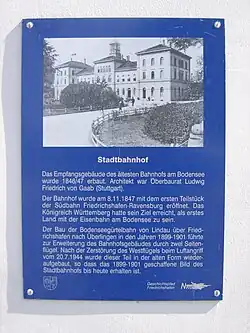Friedrichshafen Stadt station was dedicated on 8 November 1847 as the first station on Lake Constance with the opening of the first section of the Württemberg Southern Railway from Ravensburg to Friedrichshafen. This meant that the Kingdom of Württemberg had achieved its goal of completing the first railway to Lake Constance ahead of Bavaria and Baden. The station building was built between 1846 and 1848 by the architect Ludwig Friedrich von Gaab. On 26 May 1849, the Southern Railway was extended to Biberach an der Riss and on 1 June 1850 to Ulm. With the completion of Fils Valley Railway from Ulm to Stuttgart on 29 June 1850, Friedrichshafen and the Southern Railway were connected to the rest of the Württemberg railway network, allowing a continuous service from Heilbronn to Friedrichshafen. On 1 October 1899, the first piece of the Bodenseegürtel Railway (Lake Constance Belt Railway) was opened from Lindau to Friedrichshafen Stadt and opened and on 2 October 1901 the line was continued from Friedrichshafen to Überlingen, which had been connected since 1895 to Singen via Radolfzell. Two wings were added to the station building for the Bodenseegürtel Railway, which connected Bavaria, Württemberg and Baden. The Southern Railway was duplicated from 1905 to 1913. On 2 June 1922, the Württembergische Nebenbahnen AG (Württemberg Secondary Railways Company) commenced operations on the Teuringen Valley Railway (Teuringertal-Bahn) to Oberteuringen. Already in May 1923 it had to close its operations for financial reasons, before they could be restarted in 1924 by the Teuringertal-Bahn GmbH. In the Second World War the west wing was destroyed in an air raid on 20 July 1944; it was rebuilt after the war in its original form.[3] Passenger services on the Teuringen Valley Railway were closed on 23 May 1954 and freight traffic ended on 15 February 1960. The section from Friedrichshafen Stadt to the former Friedrichshafen-Zahnradfabrik station continues to operate as a siding.
