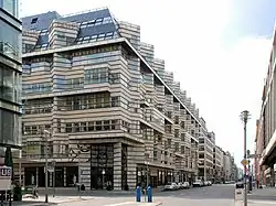 Friedrichstraße was rebuilt in the 1990s, and at the time it was the city's largest construction project; work continues north of Friedrichstraße station. From 1992 until 1996, construction works took place for a six-building, $800 million, multi-use complex developed by Tishman Speyer, among others.[4] The buildings have a city-imposed height limit of about 100 feet. A number of well-known architects contributed to the plans, including Jean Nouvel, who designed the Galeries Lafayette department store (Quartier 207); Pei Cobb Freed & Partners, who planned Quartier 206; and Oswald Mathias Ungers, who created Quartier 205.[4] Philip Johnson created parts of the American Business Center at Checkpoint Charlie, a $751 million five-building complex of offices, shops and apartments developed by Ronald Lauder and Central European Media Enterprises. The redevelopment received mixed reviews.