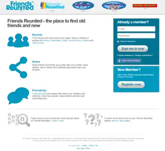 Friends Reunited was a portfolio of social networking websites based upon the themes of reunion with research, dating and job-hunting. The first and eponymous website was created by a husband-and-wife team in the classic back-bedroom Internet start-up; it was the first online social network to achieve prominence in Britain, and it weathered the dotcom bust.