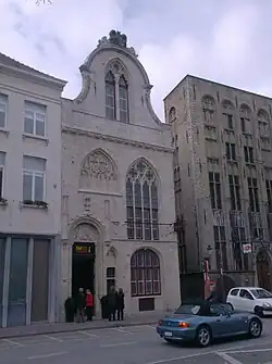 The Frietmuseum is located in the Gothic Saaihalle (former wool hall) at Vlamingstraat 33. This is one of the oldest buildings in the World Heritage listed historic centre of Bruges and dates back to 1399, with an annexe added shortly afterwards.[3][4] Throughout the fifteenth century, this building was used as a base for the activities of Genoese merchants.[5] Prior to the museum's opening, it underwent a year and a half of renovation work, including restoration of the façade. During this work, no structural changes were made to the interior of the building.[1]