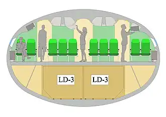 The new wide-body aircraft uses an oval fuselage configuration. The chosen form ensures minimal dimensions for the aircraft with 300–350 passengers in three cabins, three main aisles, no less than 500 mm (20 inches) wide and spaces between seats no less than 810 mm (32 inches). In an all-economy layout, the number of seats can be increased to 400. The aircraft can accommodate 302 passengers in a basic three-class layout (Business Class, Premium Economy and Economy).[4]