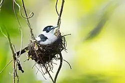 Breeding season is November to February with one brood raised. The nest is a shallow cup made of vines and sticks, woven together with spider webs and shredded plant material, and decorated with lichen. It is generally sited on a hanging loop of vine well away from the trunk or foliage of a sizeable tree about 2–10 metres (6.6–32.8 ft) above the ground. Two pink-tinged oval white eggs splotched with lavender and reddish-brown are laid measuring 19 mm x 14 mm.[11]