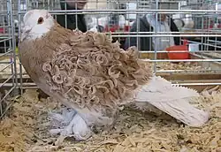 The Frillback is a breed of pigeon developed over many years of selective breeding.[1] Frillbacks, along with other varieties of domesticated pigeons, are all descendants from the rock pigeon (Columba livia). The breed is known for the frill or curls on the wing shield feathers. The feather curl should also be present at the ends of the foot feathers or muffs.[2]