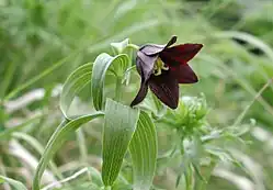 Fritillaria camschatcensis produces bulbs with several large fleshy scales, similar to those of commercially cultivated garlic. Leaves are lanceolate, up to 10 cm long, borne in whorls along the stem. Stem is up to 60 cm tall, with flowers at the top. Flowers are spreading or nodding (hanging downwards), dark greenish brown to brownish purple (chocolate colored),[3] sometimes mottled with yellow.[4][5][6][7] The flowers have a characteristic foul smell, and are pollinated by flies drawn to the offensive odor.[8]