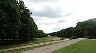 At the end of the installation's axis there is a sundial, forged in 1930 (there is also an 1830s sundial outside the manor house in the south of the park), and finally the Wheel of Life stone sculpture, carved 1933–1934. The wheel depicts four adults, a child and a baby (the baby and child are on opposite sides).