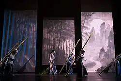 The story of the opera relates how an exceptionally beautiful moon goddess came to Earth and was confronted with human emotions when she falls in love with an Emperor before returning to the Moon. In the finale, the Moon princess, accompanied by Moon gods, departs from her cosmic abode to return to Earth.