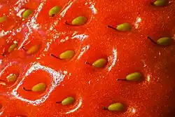 The strawberry, regardless of its appearance, is classified as a dry, not a fleshy fruit. Botanically, it is not a berry; it is an aggregate-accessory fruit, the latter term meaning the fleshy part is derived not from the plant's ovaries but from the receptacle that holds the ovaries.[23] Numerous dry achenes are attached to the outside of the fruit-flesh; they appear to be seeds but each is actually an ovary of a flower, with a seed inside.[23]