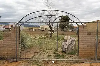 The entire cemetery is surrounded by a chain link fence, installed in the 1960s. There is an entrance on the west side. Inside the cemetery is a three-foot brick wall which encloses the family plot of Oliver Fry and his family. The family plot has thirteen graves, all of which have headstones, although one is broken and without an inscription. Outside the family plot, the vast majority of the graves are unmarked. Outside the historic cemetery there are other unmarked graves on the south and east side, some of which have been identified as the resting place of Yaqui Indians. Also outside the historic cemetery, on the east side of Seventh Street, under a commercial parking lot, lie more burial sites.[4]