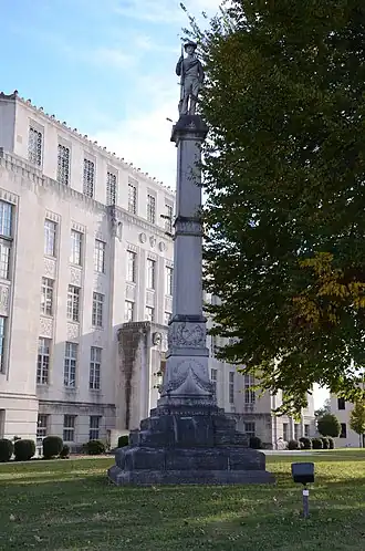 The Ft. Smith Confederate Monument stands on the grounds of the Sebastian County Courthouse at the junction of 6th and Rogers Streets in Fort Smith, Arkansas. The statue depicts a Confederate Army soldier, standing facing north, holding the upper stock of his rifle, which is grounded. The sculpture is 6 feet (1.8 m) in height, and is mounted on a square columnar pedestal over 30 feet (9.1 m) tall. The monument was placed in 1903 with funding raised by the local chapter of the Daughters of the Confederacy. An earlier Confederate memorial, placed at Fort Smith National Cemetery, was destroyed by a tornado, and the federal government objected to the placement of this memorial there without alterations to also commemorate the Union dead. The city granted permission for its placement at its current location.[2]