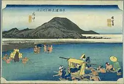 The classic ukiyo-e print by Andō Hiroshige (Hōeidō edition) from 1831 to 1834 depicts travellers crossing the Abe River to the west of the post station. A woman is being carried in a kago, while other people are fording the stream on foot.