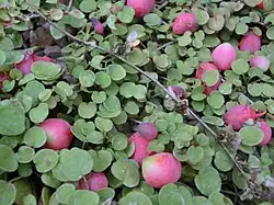 The small, red, crunchy fruit is edible, although rarely eaten. It has been described as slimy and bland.[13]