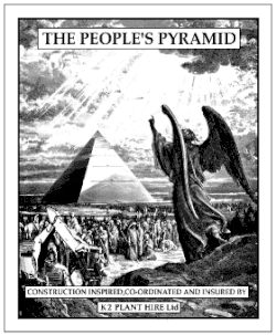 Around the time of the single's release, further full-page adverts appeared in the national press, this time asking readers "***k The Millennium: Yes/No?", with a telephone number—the "Millennium Crisis Line"—provided for voting: "If you want to fuck the millennium, press '1'. If not, press '2'."[33] The adverts were placed by K2 Plant Hire Ltd., who duly claimed that 18,436 (89%) of respondents wished to fuck the millennium. Thus, on 31 October 1997, K2 Plant Hire announced plans to build the "Great Northern Pyramid Of The People", or "The People's Pyramid",[40] from as many house bricks as there were British 20th century births.[41] The company estimated that the structure would require approximately 87 millions bricks; be 150-foot (46 m)-high; and take five years to complete, all at no cost to the taxpayer.[40][41] Members of the public were urged to donate bricks, with 1.5 bricks per Briton being needed to complete the project.[40][41] K2 Plant Hire promised that the Pyramid "will be open to the public free of charge, 24 hours a day, 365 days a year. You will be able to do what you want with it. Climb it, paint it, polish it, eat your sandwiches on it or chip it away. It will stand for as long there is any of it left. It will promote nothing. Be sponsored by nobody. And owned by everybody.";[40] Melody Maker noted the pointed contrast of the "intended virtues" of the People's Pyramid with "the drawbacks of the officially sponsored Millennium Dome".[40] The Guardian noted drily that the idea "would appear to be far-fetched even by [Cauty and Drummond's] own standards" and that "planning permission might pose a problem."[42][n 3]