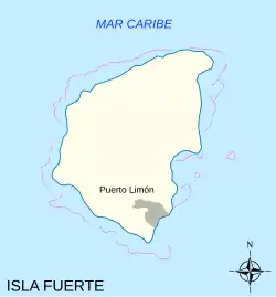Fuerte Island (Isla Fuerte) is a small coral island[1] in the Caribbean Sea off the northern coast of Colombia, Córdoba department, located south of the Gulf of Morrosquillo. It is located at a distance of 11 km from mainland Colombia. It is part of the chain of islands formed by the Rosario Islands, the Archipelago of San Bernardo and Tortuguilla Island.