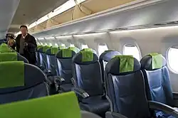 Fuji Dream Airlines' aircraft cabins consist of either 76 or 84 economy class seats, with each seat measuring approximately 18 inches (46 cm) wide with a standard seat pitch of 31 inches (79 cm). On the airline's flights, complimentary refreshment services are offered.[47] The airline also has an in-flight magazine titled Dream 3776, with its name originating and derived from the airline's name and Mount Fuji's 3,776 m (12,388 ft) elevation.[48]