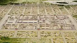 In early research, Fujiwara-kyō was assumed to be located inside the Yamato Sanzan (Mount Miminashi to the north, Mount Unebi to the west, and Mount Amanokagu to the east), and was thought to be a rectangle of 12 rows and 8 blocks measuring 2.1 kilometers east-to-west and 3.2 kilometers north-to-south, with Fujiwara Palace located slightly north of the center. However, with the discovery of the east-west Kyōgoku-ōji street in the 1990s, the complete layout to be 5.3 kilometers (10ri) square, or at least 25 km2, surpassing both Heian-kyō (23 km2) and Heijō-kyō (24 km2), and encompassed the site of the old Asuka-kyō to the south.[1][4] A distinctive feature of the capital is that, unlike Heijo-kyō, and Heian-kyō, which were built in the Northern Court style with the palace and government offices in the north, Fujiwara Palace, which contained the Imperial Palace and government offices, was located almost in the center of the capital. It is believed that this was designed based on the ideal capital city construction described in the "Kaogongji" (Record of the Winter Palace) in Rites of Zhou (Records of the Zhou Dynasty), rather than imitating Chang'an, as a sign of Emperor Tenmu's rivalry with the Tang Dynasty. The grid pattern within an area of 5.3 kilometers east-to-west (20 grids) and 4.8 kilometers north-to-south (18 grids). Suzaku-oji, the main street, ran north and south from Fujiwara Palace, dividing the city into east and west halves. The Fujiwara-kyō Suzaku-oji was not as wide as later Heijō-kyō and Heian-kyō, which were more than 70 meters wide, but was very narrow, just over 24 meters wide (between the centers of the gutters). There is a theory that Suzaku-oji and Rajomon on the south side of the Asuka River were not developed in the capital due to lack of archaeological evidence and the presence of a number of large Buddhist temples in that area.[5]