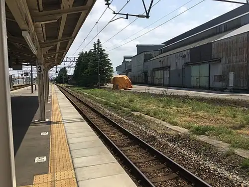 From 14 March 2015, with the opening of the Hokuriku Shinkansen extension from Nagano to Kanazawa, local passenger operations over sections of the Hokuriku Main Line running roughly parallel to the new shinkansen line were reassigned to different third-sector railway operating companies.[1] From this date, Fukuoka Station was transferred to the ownership of the third-sector operating company Ainokaze Toyama Railway.