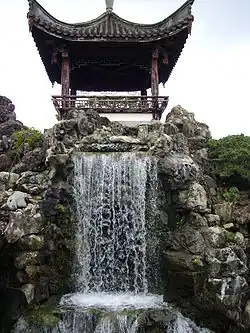 The garden was built nearly entirely with the use of wood and stone from Fuzhou, with the help of artisans from Fuzhou, and according to specifications representative of traditional gardens in Fuzhou. It thus contains many of the elements essential to the design of a traditional Chinese garden. It is walled, divided into individual sections, features much asymmetry, rocks including scholar's rocks, and water in the form of a single pond which extends into most sections of the garden. Several bridges in a variety of styles extend over the pond, which houses koi and turtles, a symbol of longevity and wisdom in Chinese culture. The centerpiece of the garden perhaps is its waterfall, located on the west side of the pond, directly facing the east entrance. The rock pile it flows from contains an artificial cave, and can be entered, and climbed; stairs cut into the rock lead to a Chinese-style pavilion, one of two high points in the garden allowing for a view of much of the garden, and the surrounding scenery.