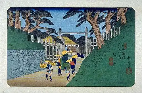 Utagawa Hiroshige's ukiyo-e print of Fukushima-juku depicts the Fukushima Barrier, with two travelers in the background kneeling before an official as their documents are examined. In the foreground, a porter with loaded panniers passes in front of an elderly samurai with a stick walking away from the barrier. Behind, a man with his face hidden by a large green cloak and a sedge hat and two travellers approach the gate.