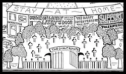 In addition, the artist summarised his experience in a piece called Quarantine + Pandemic Survival Map. In an interview with The Guardian, he said he created this work because “I had this overwhelming feeling of helplessness after I came out of quarantine, and I felt so far from home. I started the tongue-in-cheek Quarantine + Pandemic Survival Map immediately after – I wanted to offer back all the things I’d been thinking about in a visual form.”[19]