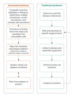 An automated synthesis is very similar in procedure to performing a manual synthesis. The overseeing chemist decides on a target molecule then formulates the experimental plan, which is a sequential series of steps. Then, they collect the required equipment and execute the plan. The automated synthesis follows the same pathway, except that the computer devises and executes the experimental plan. However, human revision is usually still required to ensure the automated route is practical and there are no implicit steps or conditions missing from the proposed procedure.[2]