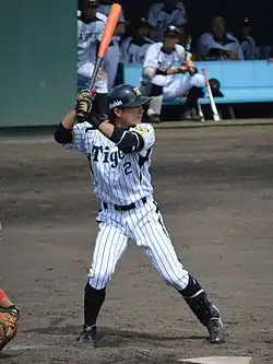 He again joined the main squad during spring training, and batted well during the exhibition games (0.333) which earned him a spot in the opening day roster. His first appearance was as a pinch-hitter on April 4, where he hit a solo home run against the Baystars' Kenta Ishida.[11] A few games later, he began being included in the starting line up, and his starts gradually increased either as a 2nd or 3rd baseman.[12] As Toritani went into a slump later in July, he then took over as the team's main shortstop.[13] By August, he was batting lead-off at 0.311, and experienced his first Hero interview after he hit the winning run on August 10.[14] He continued to hit well and reached his 100th hit by September 24, and became the 4th Hanshin player drafted out of high-school to reach 100 hits within his first four seasons.[15] He spent the entire season in the main squad and appeared in 122 games, the most appearances among the team's infielders.[16] At the plate, he finished with an average of 0.273, batted in 33 RBIs including 5 home runs, but defense-wise, he committed the most errors (12). Nevertheless, his improved overall performance earned him a pay raise that tripled his previous salary to 22 million yen.[17]