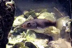 The longnose killifish (Fundulus similis) is a marine tropical benthopelagic fish of the genus Fundulus and the family Fundulidae.[2] It is endemic to the western Atlantic Ocean, ranging from along the coast of the Gulf of Mexico from the Florida Keys to Tampico in Mexico.[1] It can grow up to 12 centimeters in length. The body is rounded, elongate, and olive to silver colored with dark vertical stripes. It can be distinguished from other killifish by its long snout and a dark spot on last vertical bar.[3] This species requires a new binomial, as Fundulus similis is preoccupied by a junior synonym of Fundulus majalis, the name having been given to a Gulf of Mexico population of that species.[2]