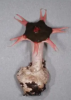They are known commonly as the ‘Flower fungus’ as it has 5–9 red petal-like arms on its fruiting body which can be seen above its soil substrate.[4] The fruiting body can grow to 80mm long, with a 35mm diameter disc.[17]