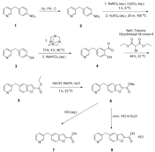 - ^ a b c Johnson RA, Nidy EG, Aiken JW, Crittenden NJ, Gorman RR (August 1986). "Thromboxane A2 synthase inhibitors. 5-(3-Pyridylmethyl)benzofuran-2-carboxylic acids". Journal of Medicinal Chemistry. 29 (8): 1461–8. doi:10.1021/jm00158a024. PMID 3735314.