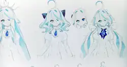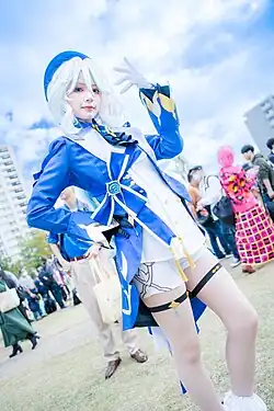 Furina's base outfit pairs a typical morning dress (used to demonstrate her nobility) with shorts (which index her mobility and more playful side). Other elements of her outfit were inspired by French and Christian culture. Influences from French culture include the "ruff collar" design of her socks, the design on her hat that resembles the Iris flower, as well as her ribbons. Building onto these, additional elements of her outfit were inspired by classical stories and musicals, such as a fish-tail shaped decoration on her back that was inspired by "The Little Mermaid".[3][4][7] Additionally, "La vaguelette", a song performed by Furina with lyrics entirely in French, incorporates inspirations from musicals itself. The song's composition reflects themes demonstrated throughout Furina's story in Genshin Impact.[8] She is voiced by Amber Lee Connors in English, Inori Minase in Japanese, Qian Chen in Chinese, and Kim Ha-yeong in Korean.[1][2] "La vaguelette", however, is performed by Cécilia Cara.[8]