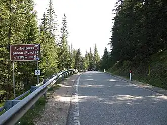 The Furkelpass also Furkelsattel or simply the Furkel called (Ladin Ju de Furcia, Italian Passo Furcia), is a 1789 m high mountain pass in the Dolomites. The pass lies between the 2275 m high Kronplatz in the north and the 2507 m high Piz da Peres in the south and links the towns of Olang in the Puster Valley and San Vigilio in Mareo. The pass marks the linguistic border between the German and Ladin speaking areas of northern Italy.