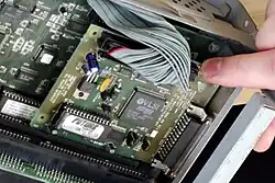 The company's first product, marketed under its new name Future Domain, was the TMC-820, an inexpensive, 8-bit[5] SCSI host adapter for the IBM Personal Computer. Introduced in early 1986, the TMC-820 was marketed on the merit of its ease of use, omitting any jumpers on board, configuration instead being done in firmware as well as drivers on floppy disk.[4] Future Domain was one of the first SCSI host adapter manufacturers on the market, at a time when Adaptec and NCR had dominated the field as early pioneers.[6] The built-in firmware supported Seagate and Rodime's SCSI hard disk drives introduced in the same year, as well as graphical laser printers (being one of the first plug-and-play SCSI host adapters with native support for printers).[4][7]: 55 It also supported the first CD-ROM drives on the market at the time. The fastest data transfer rate the TMC-820 supported, in terms of bandwidth, was 32 MHz.[7]: 55 Future Domain followed this up with the TMC-870 in late 1986, which added support for 360-KB and 1.2-MB 5.25-inch floppy disk drives, allowing users to consolidate their expansion cards by negating the need for a separate floppy controller.[8][5]