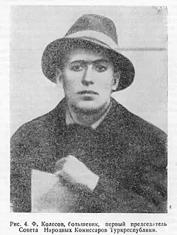 From November 1917 to November 1918, Fyodor Kolesov was the chairman of the Council of People's Commissars (SNK) of the Turkestan Autonomous Soviet Socialist Republic, that is, the head of the Turkestan Republic and a member of the Turkestan Regional Party Committee. During this period, he personally commanded the troops that suppressed attempts to create autonomy in Ashgabat (the so-called Transcaspian Government) and Kokand (the Kokand Autonomy),[2] as well as the Revolutionary troops that tried to overthrow the Emir of Bukhara by force in March 1918.
